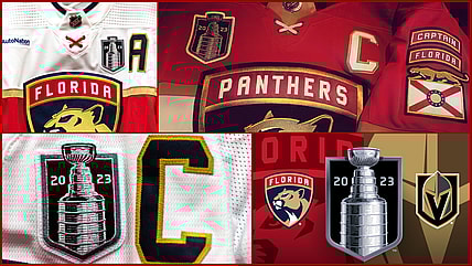 Florida panthers place stanley cup final patch on left side of road jersey sweater due to advertisement, sponsorship, vegas golden…